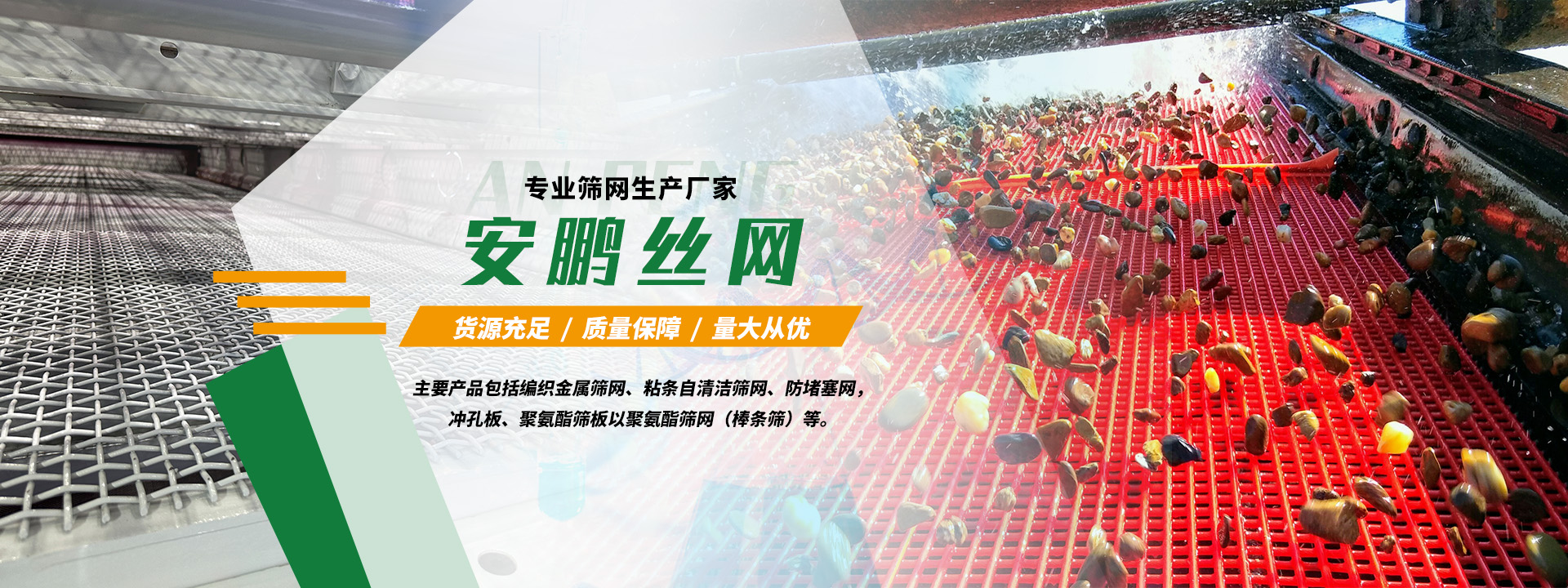 安平縣安鵬絲網過濾器材有限公司,是一家專業的篩網生產廠家。我們為骨料,采礦,建筑以及回收行業等提供完整且標準化的定制篩分解決方案。我們的主要產品包括編織金屬篩網、粘條自清潔篩網、防堵塞網,沖孔板、聚氨酯篩板以聚氨酯篩網(棒條篩)等。 工廠占地345,000平方英尺,擁有25條生產線,20多年來專注于工業篩網解決方案。安鵬產品采用獨特的原材料處理技術,精確的網孔尺寸和優良的網面平整度,保證了篩面的緊實度和耐磨性,從而打造出最強勁的篩網。按照ISO4783:3的標準,我們可以生產A、C、D、E型篩網。我們能夠獨立完成拔絲、軋花、織網、包裝、倉儲和裝箱等工作。我們擁有先進的生產設備,強大的技術團隊和嚴格的質量控制措施,這些優勢使得我們公司在篩選解決方案領域成為美國、加拿大和澳大利亞市場上···